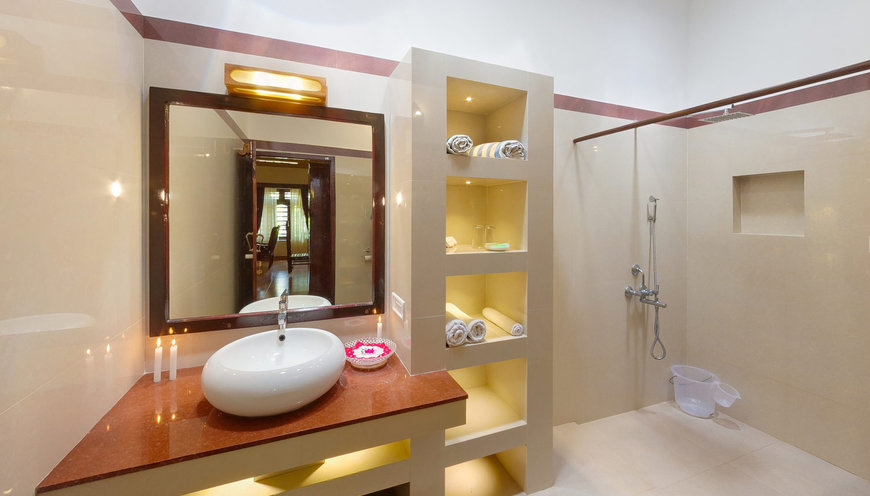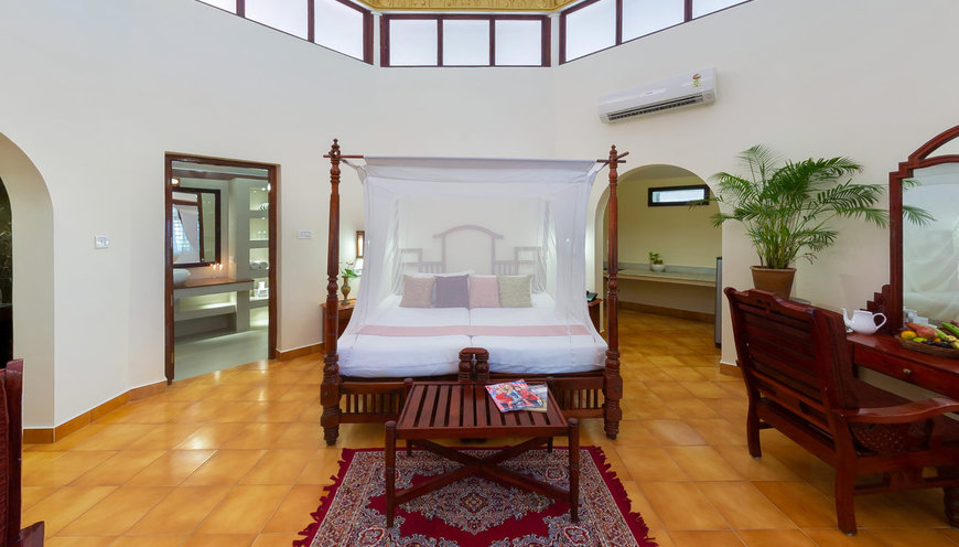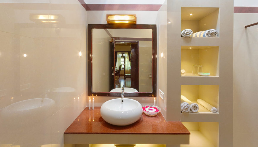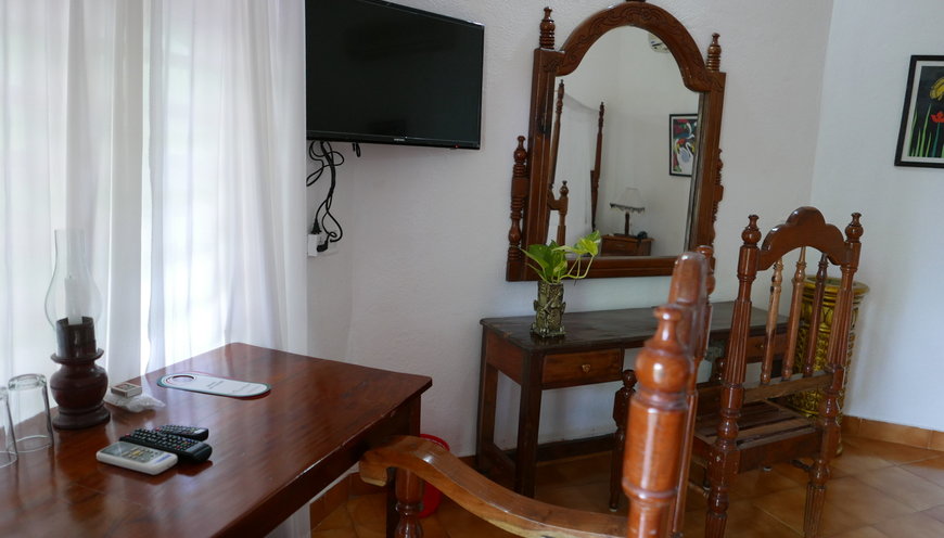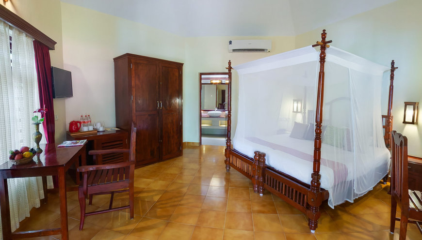 В современном керальском коттедже есть очень большая кровать с антимоскитным пологом, шкаф для одежды, письменный стол у окна и туалетный столик с зеркалом. Кондиционер создает оптимальный микроклимат. Кондиционированный номер, кроме прочего, оснащен телевизором и холодильником.